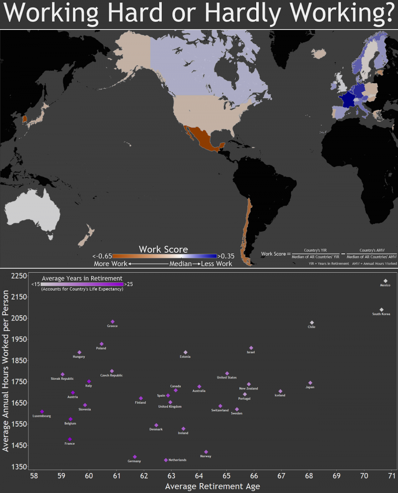 Η λογική ανάγνωσης του γραφήματος είναι η ακόλουθη: Όσο πιο κόκκινο ή πορτοκαλί είναι το χρώμα μιας χώρας, τόσο περισσότερο εργάζεται ο λαός της (πρώτες στο γράφημα η Νότια Κορέα και το Μεξικό).