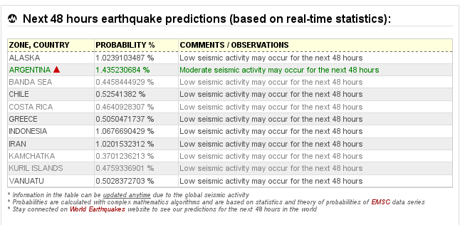 Συγκεκριμένα, η ιστοσελίδα World Earthquakes στην επιλογή Earthquakes Prediction (πρόβλεψη σεισμών) όπου χρησιμοποιούνται μαθηματικές ακολουθίες για την πρόβλεψη σεισμών, ανακοίνωσε πως μέσα σε δύο ημέρες υπήρχε πολύ υψηλός κίνδυνος σεισμού στην Ελλάδα, ο οποίος θα κυμαινόταν από 5 έως 6 Ρίχτερ.