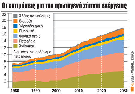 Την ίδια ώρα, η αναμενόμενη αύξηση της ενεργειακής ζήτησης έως το 2035 σημαίνει πως θα χρειαστούν επενδύσεις ύψους 38 τρισεκατομμυρίων δολαρίων σε ενεργειακές υποδομές ή 1,5 τρισ. ετησίως. Το πετρέλαιο και το φυσικό αέριο θα είναι οι μεγαλύτεροι αποδέκτες αυτών των κεφαλαίων, αντλώντας, σύμφωνα με τη Merrill, που επικαλείται μελέτες της ΙΕΑ, περί τα 20 τρισ. Η ηλεκτροπαραγωγή θα καλύψει τα άλλα 17 τρισ.