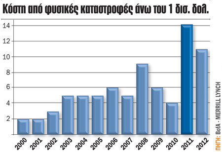 Σύμφωνα με τη Merrill Lynch, ο ετήσιος λογαριασμός από φυσικές καταστροφές ανέβηκε το 2005 έως τα 200 δισεκατομμύρια δολάρια, με καταλύτη τότε τον τυφώνα Κατρίνα. Όμως, και το 2011 όπως και το 2012 αποδείχθηκαν τα δύο χειρότερα χρόνια στα καταγεγραμμένα χρονικά όσον αφορά τα ακραία καιρικά φαινόμενα, με αποτέλεσμα καταστροφές αξίας μεγαλύτερης των 170 δισεκατομμυρίων δολαρίων, και μάλιστα κυρίως σε επιχειρήσεις. Σε αυτό το περιβάλλον, το 90% των εισηγμένων διεθνών επιχειρήσεων που παρακολουθεί ο S&P Global 100 σε διάφορους κλάδους δηλώνει πως τα καιρικά φαινόμενα και οι συνδεόμενες με αυτά καταστροφές αποτελούν κορυφαίο ρίσκο για τις προοπτικές τους. Παρά τούτο, παρατηρείται το ιδιαίτερα ανησυχητικό φαινόμενο ποσοστό μικρότερο του 50% των επιχειρήσεων αυτών να έχουν αρχίσει να ενσωματώνουν στα επιχειρηματικά τους σχέδια προσαρμογές της λειτουργικής τους δραστηριότητας στην κλιματική αλλαγή. Η ένταση και η έκταση, όμως, των ζημιών είναι τέτοια, που σταδιακά αυτό αλλάζει, και μάλιστα με επιταχυνόμενους ρυθμούς. Παράλληλα με όλα τα παραπάνω, ο πληθυσμός του πλανήτη αυξάνεται, δημιουργώντας πρόσθετα προβλήματα. Το ζήτημα της ύδρευσης, της διατροφής και της ενεργειακής ασφάλειας είναι τα κυριότερα, σύμφωνα με τη Merrill. Έως το 2030 η παγκόσμια ζήτηση για τροφή αναμένεται να αυξηθεί κατά 50%.
