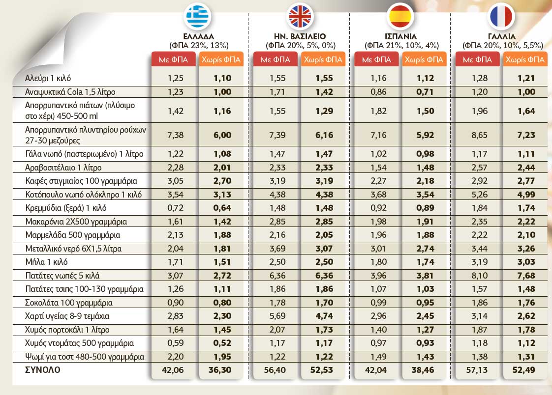 Παρά τους υψηλούς συντελεστές ΦΠΑ, το συγκεκριμένο «καλάθι» είναι στην Αγγλία και τη Γαλλία κατά 36% και 34% ακριβότερο σε σχέση με το αντίστοιχο της Ελλάδας. Με την Ισπανία δεν υπάρχουν διαφορές.