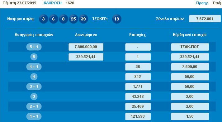 Στην κλήρωση βρέθηκε ένα 5αρι που παίρνει περίπου 340.000 ευρώ.