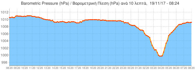 Τα τρία παρακάτω διαγράμματα του meteo.gr απεικονίζουν την μεταβολή της πίεσης, της ταχύτητας του ανέμου και ης βροχής στο σταθμό μας στο Αιτωλικό, όπου διακρίνεται καθαρά η πτώση της πίεσης όσο πλησίαζε ο Ζήνων καθώς και η άνοδός της στη συνέχεια, ενώ πολύ ενισχυμένοι ήταν οι άνεμοι όσο ο Ζήνων πλησίαζε, με ριπές στα 70 km/h, νηνεμία όταν το "μάτι του Ζήνωνα βρέθηκε πάνω από την περιοχή με εκ νέου ισχυρούς ανέμους όπως ο Ζήνων μετακινήθηκε ανατολικά. Παρόμοια συμπεριφορά παρουσιάζει και το διάγραμμα της βροχής.