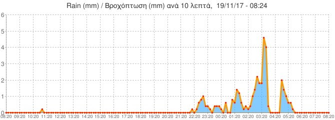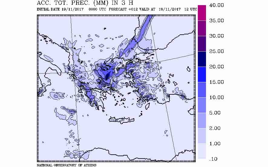 Ο παρακάτω χάρτης παρουσιάζει τις βροχές που προβλέπονται το μεσημέρι της Κυριακής 19/11 στη χώρα μας.