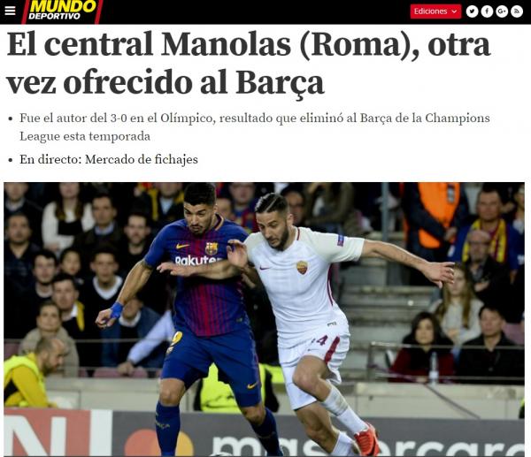 «Δεν είναι η πρώτη φορά που στην Μπαρτσελόνα προτάθηκε ο Κωνσταντίνος Μανωλάς (14.06.1991), ο Έλληνας κεντρικός αμυντικός της Ρόμα. Συνέβη ήδη την περασμένη σεζόν, αν και στο «Καμπ Νου» αποφάσισαν να στοιχηματίσουν στον Γέρι Μίνα. Καθώς ο Κολομβιανός δεν μπορούσε να προσαρμοστεί, οι Καταλανοί αναζητούσαν μια εναλλακτική λύση. Τότε έφτασε η πρόταση για τον Μανωλά. Τη σεζόν 2016-2017, η Μπαρτσελόνα έδωσε τον Βερμάελεν στη Ρόμα. Η συμφωνία περιλάμβανε μια προτεραιότητα στην αγορά του Έλληνα, η οποία δεν ενεργοποιήθηκε» ανέφερε η ισπανική εφημερίδα.