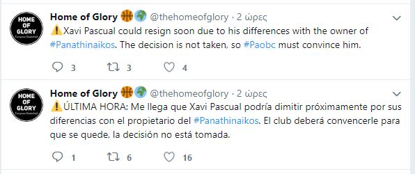 «Ο Τσάβι Πασκουάλ ίσως παραιτηθεί σύντομα, λόγω διαφορών με τον ιδιοκτήτη του Παναθηναϊκού. Η απόφαση δεν έχει παρθεί, οπότε ο Παναθηναϊκός θα χρειαστεί να τον πείσει», αναφέρει το χαρακτηριστικό tweet του Home of Glory.