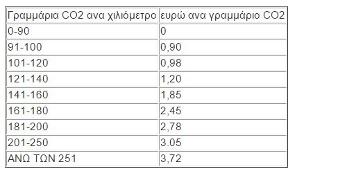 Επιβατικά αυτοκίνητα ταξινομούμενα για πρώτη φορά την Ελλάδα από 1.11.2010 και μετά, αποκλειστικά με βάση τις εκπομπές διοξειδίου του άνθρακα (γραμμάρια C02 ανά χιλιόμετρο). Λαμβάνονται υπόψιν οι εκπομπές διοξειδίου του άνθρακα όπως αυτές αναγράφονται στην άδεια του οχήματος ως εξής: