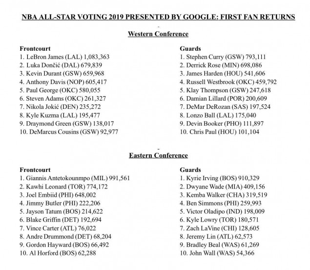 Πρώτος σε Ανατολή και Δύση, είναι ο ΛεΜπρόν Τζέιμς, με τον «Βασιλιά» μάλιστα να είναι και ο μοναδικός που συγκέντρωσε αμέσως 1.000.000 ψήφους (σ.σ. 1.083.363). O σούπερ σταρ των Λέικερς οδηγεί την ψηφοφορίας της Δύσης, με δεύτερο τον Στεφ Κάρι (793.111 ψήφους).