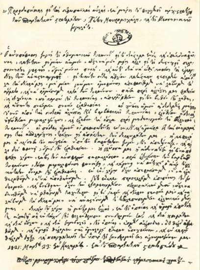 Εν ενί λόγω απεφασίσαμεν, ή να ελευθερωθώμεν, ή να αποθάνωμεν. Τούτου ένεκεν προσκαλούμεν επιπόνως την συνδρομήν και βοήθειαν όλων των εξευγενισμένων Ευρωπαίων γενών, ώστε να δυνηθώμεν να φθάσωμεν ταχύτερον εις τον Ιερόν και δίκαιον σκοπόν μας και να λάβωμεν τα δίκαιά μας.