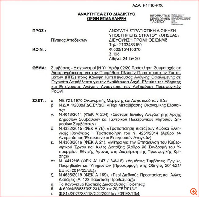 Η Ανώτατη Στρατιωτική Διοίκηση Υποστήριξης Στρατού (ΑΣΔΥΣ) του Υπουργείου Εθνικής Άμυνας έχει κάνει προκήρυξη αγοράς μηχανημάτων εξοπλισμού και προμήθειας πλωτού φράγματος , με τεχνικά χαρακτηριστικά όπως αυτών για αντιμετώπιση περιστατικών ρύπανσης περιοχής θαλασσίου χώρου, για την εκτέλεση της αποστολής των Μονάδων Στρατού Ξηράς, όσον αφορά την αντιμετώπιση των προσφυγικών ροών. Είναι χαρακτηριστικό ότι στο έγγραφο με την Υπ’Αριθμ.02/20 πρόσκληση του υπουργείου Αμυνας (ΑΔΑ:Ρ1Γ16-ΡΧ6) , το οποίο εκδόθηκε στις 24 Ιανουαρίου 2020, σημειώνεται ότι αντικείμενο της σύμβασης είναι, η προμήθεια 2.700 μέτρων πλωτού προστατευτικού συστήματος , "μη στρατιωτικών προδιαγραφών, συγκεκριμένων χαρακτηριστικών για την εκτέλεση της αποστολής των Μονάδων ΣΞ, στο πλαίσιο συνδρομής των Ενόπλων Δυνάμεων στην διαχείριση της προσφυγικής κρίσης για την αντιμετώπιση της διαρκώς αυξανόμενης μεταναστευτικής/ προσφυγικής ροής".