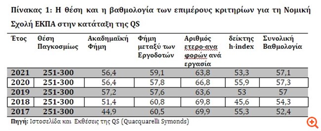 Στον πίνακα 1 αποτυπώνεται η θέση και η βαθμολογία των επιμέρους κριτηρίων για τη Νομική Σχολή του ΕΚΠΑ, την τελευταία πενταετία. Θα πρέπει να επισημανθεί ότι η ανώτερη συνολική βαθμολογία που μπορεί να λάβει ένα Πανεπιστήμιο είναι ο βαθμός 100. Με βάση την εικόνα της τριετίας, φαίνεται παρά τις μικρές διακυμάνσεις και αυξομειώσεις στα επιμέρους κριτήρια, η ανοδική πορεία της Σχολής, η οποία την πενταετία 2017-2021 αύξησε τη συνολική βαθμολογία της κατά 9%. Επιπροσθέτως είναι εμφανής η βελτίωση της ακαδημαϊκής φήμης της Σχολής, με την βαθμολογία της στο συγκεκριμένο κριτήριο να αυξάνεται κατά 25,6% σε σχέση με το 2017. Παρά την οικονομική κρίση οι εργοδότες δίνουν ψήφο εμπιστοσύνης στη Νομική Σχολή του ΕΚΠΑ, η οποία διατηρεί την 1η θέση στην προτίμηση των εργοδοτών στην Ελλάδα.
