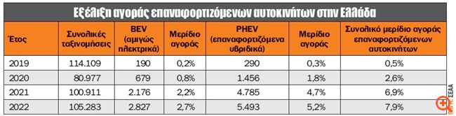 Σε απόλυτα νούμερα και σύμφωνα με νεότερα στοιχεία, το 2022 ταξινομήθηκαν 8.320 επαναφορτιζόμενα αυτοκίνητα έναντι 6.961 το 2021 και 2.135 το 2020.