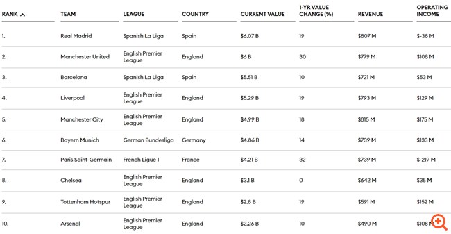 Η αξία δύο ομάδων υπερβαίνει πλέον τα 6 δισ. δολάρια. Η Ρεάλ Μαδρίτης βρίσκεται στην πρώτη θέση με αποτίμηση στα 6,07 δισ. δολάρια, σκαρφαλώνοντας κατά 19% σε σύγκριση με την αξία πέρυσι. Η ισπανική ομάδα έχει φτάσει στους πέντε από τους τελευταίους εννέα τελικούς του Champions League, κερδίζοντας και τους πέντε - επιτυχίες που υπήρξαν εξαιρετικά κερδοφόρες. Επιπλέον, η Ρεάλ εξασφάλισε περίπου 400 εκατ. δολάρια από την Sixth Street and Legends στο πλαίσιο μιας συμφωνίας 20ετούς διάρκειας που θα αυξήσει τα έσοδα για το club από τις εγκαταστάσεις και τις δραστηριότητες στο γήπεδο "Σαντιάγο Μπερναμπέου", που βρίσκεται υπό ανακαίνιση, η οποία θα ολοκληρωθεί το 2024.