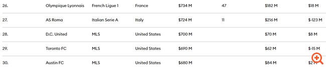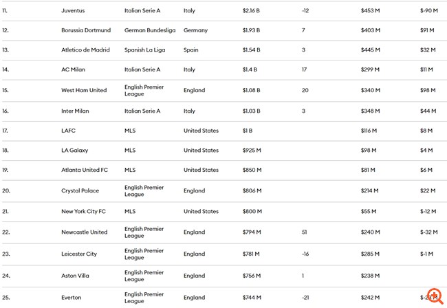 Πώς εξηγούνται οι τόσο μεγάλες αποτιμήσεις; Η Μάντσεστερ Γιουνάιτεντ σκορπάει μετρητά, δημιουργώντας λειτουργικά έσοδα ύψους 108 εκατ. δολαρίων (κέρδη προ τόκων, φόρων, αποσβέσεων) για το 2021-22. Ωστόσο, σε πολλές περιπτώσεις οι επενδυτές αγοράζουν τα brand names και όχι τα κέρδη. Η ΠΣΖ κατέγραψε λειτουργικές ζημιές 219 εκατ. δολαρίων το 2021-22, ενώ τα λειτουργικά έσοδα της Los Angeles FC ήταν μόλις 8 εκατ. δολάρια το 2022. Οι 30 ομάδες της φετινής λίστας είχαν κατά μέσο όρο λειτουργικά έσοδα 23 εκατ. δολάρια σε συνολικά έσοδα 386 εκατ. δολαρίων κατά μέσο όρο.