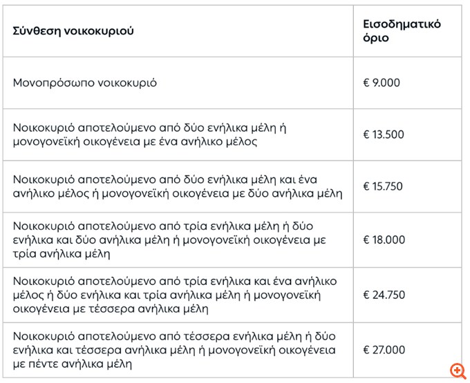 Για κάθε επιπλέον ενήλικο μέλος προστίθεται το ποσό των 4.500 ευρώ και για κάθε επιπλέον ανήλικο μέλος το ποσό των 2.250 ευρώ, μέχρι του συνολικού ορίου των 31.500 ευρώ ανεξαρτήτως του αριθμού των μελών του νοικοκυριού. Το συγκεκριμένο ανώτατο όριο (31.500 € ) αυξάνεται κατά 8.000 ευρώ για νοικοκυριό που στη σύνθεσή του περιλαμβάνει και άτομο ή άτομα με αναπηρία εξήντα επτά τοις εκατό (67%) και άνω και κατά 15.000 ευρώ για νοικοκυριό που στη σύνθεσή του περιλαμβάνει και άτομο ή άτομα που έχουν ανάγκη μηχανικής υποστήριξης με χρήση ιατρικών συσκευών, η οποία παρέχεται κατ' οίκον και είναι απαραίτητη για τη ζωή τους.