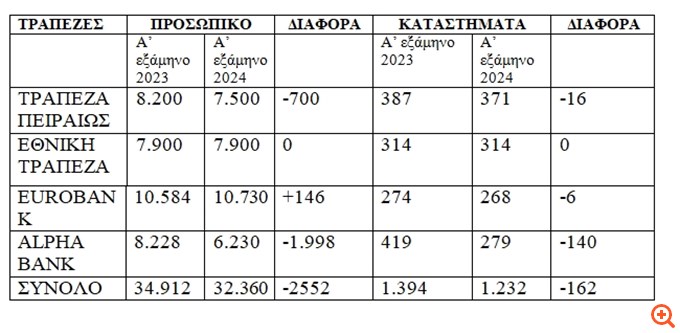 Προς επίρρωση, μόνο τον τελευταίο χρόνο αποχώρησαν από τις τράπεζες περισσότεροι από 2.500 υπάλληλοι, ενώ μπήκε "λουκέτο" σε 162 καταστήματα. Ειδικότερα. η Eurobank στα τέλη του περασμένου Ιουνίου διέθετε 10.730 υπαλλήλους (6.314 στην Ελλάδα) έναντι 10.584 τον Ιούνιο του 2023 και λειτουργούσε 268 καταστήματα έναντι 274 πριν ένα χρόνο. Η Alpha Bank σε ετήσια βάση περιόρισε το προσωπικό της κατά 1.998 άτομα – από 8.228 τον Ιούνιο του 2023 σε 6.230 τον ίδιο μήνα του 2024 – αναστέλλοντας τη λειτουργία 140 καταστημάτων (πλέον διαθέτει 279, εκ των οποίων 265 στην Ελλάδα, έναντι 419 τον Ιούνιο του 2023). Η ΕΤΕ προ διμήνου αριθμούσε 7.900 άτομα προσωπικό (6.800 στην Ελλάδα) και 314 καταστήματα, ενώ από την Τράπεζα Πειραιώς τον τελευταίο χρόνο έχουν αποχωρήσει περί τα 700 άτομα, διαθέτοντας στα τέλη του περασμένου Ιουνίου 7.500 υπαλλήλους έναντι 8.200 τον ίδιο μήνα του 2023. Όσον αφορά στα καταστήματα, σε ετήσια βάση έχουν μειωθεί κατά 16 (371 σήμερα έναντι 387 το α’ εξάμηνο του 2023).