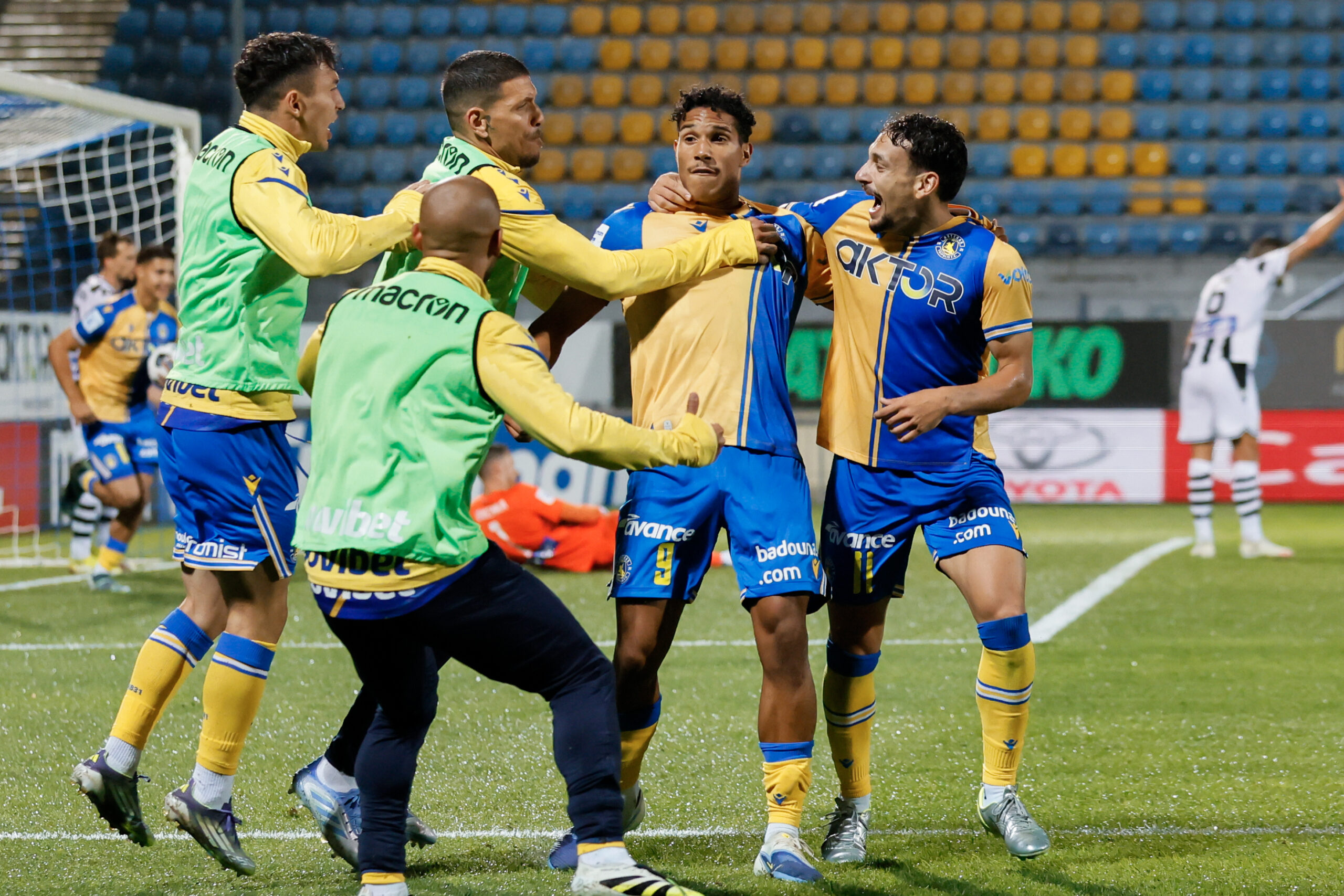 Ο Τζοακίνι πανηγυρίζει με τους συμπαίκτες του το γκολ της ισοφάρισης/ EUROKINISSI