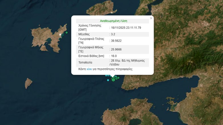 Σύμφωνα με το Γεωδυναμικό Ινστιτούτο, το επίκεντρο του σεισμού εντοπίζεται 28 Χλμ. ΒΔ της Μήθυμνας Λέσβου ενώ το εστιακό βάθος υπολογίζεται στα 16 χιλιόμετρα.