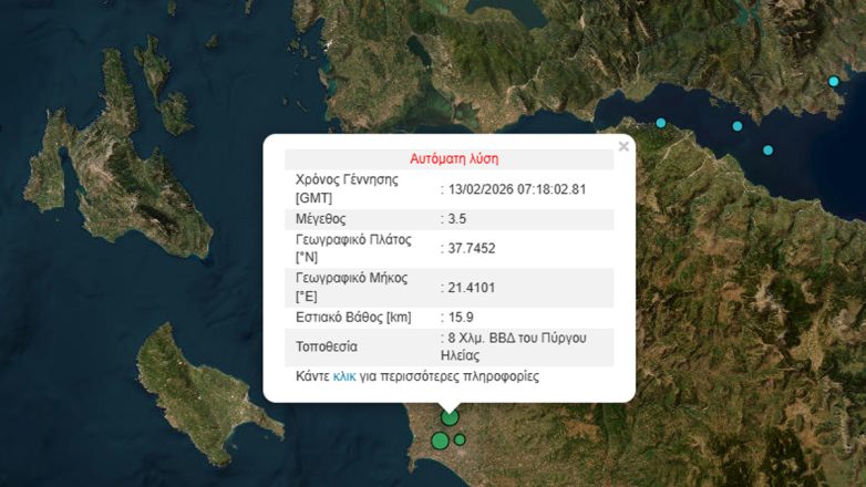 Σεισμική δόνηση έγινε αισθητή στον Πύργο Ηλείας στις 09:18 το πρωί της Παρασκευής 13/02/2026, με μέγεθος 3,5 Ρίχτερ.