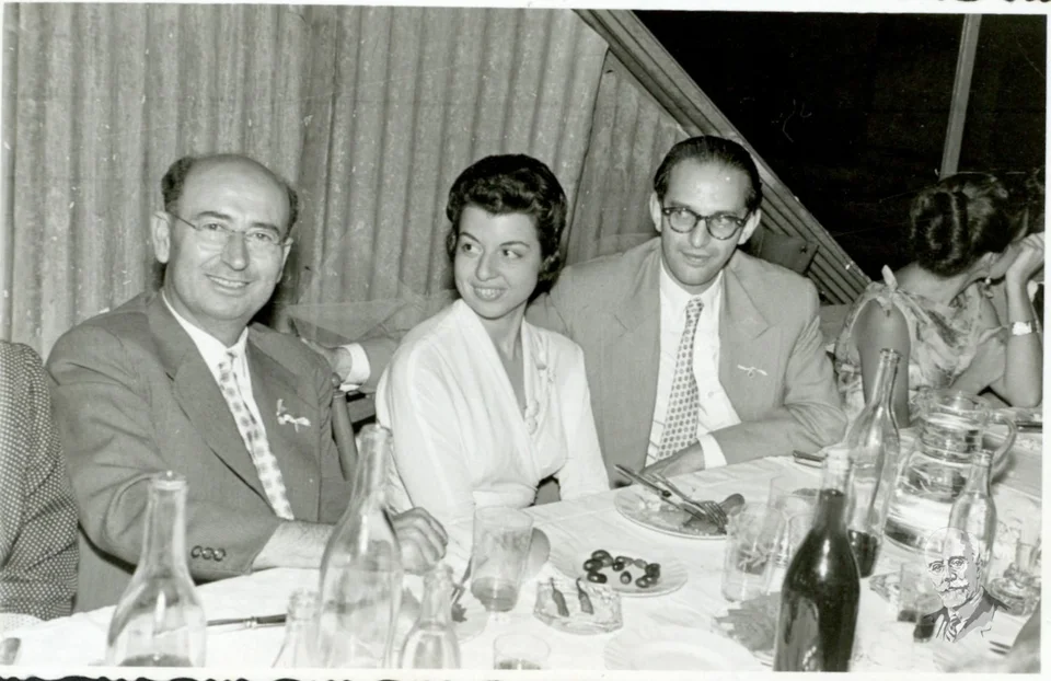 Ο Ελευθέριος και η σύζυγός του, Λίλη, με τον Ευτύχιο Νικολιουδάκη σε τραπέζι βάπτισης στα Χανιά (1957)